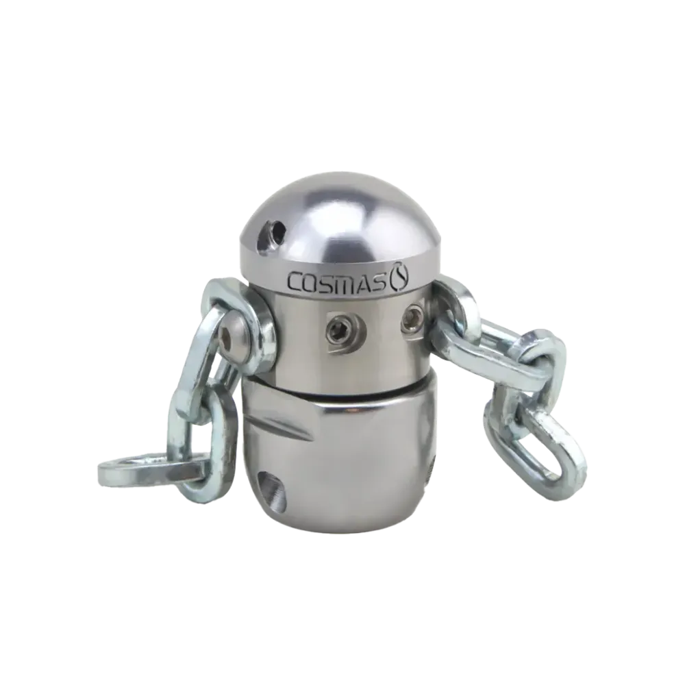Nerezová čistící rotační tryska je osazena vysoce odolnými řetězy, které zajišťují účinné mechanické čištění vnitřního povrchu potrubí. Tryska je dostupná s nerezovými nebo keramickými vložkami, přičemž keramické vložky jsou doporučovány zejména při použití recyklované nebo znečištěné vody díky své vyšší odolnosti a delší životnosti. Trysky jsou k dispozici se čtyřmi vyměnitelnými hlavicemi – plná (cover), vrtací (drilling), karbidová (karbid) a nožová (knives), což umožňuje jejich přizpůsobení různým typům nečistot a pracovních podmínek. Maximální tlak 250 bar.