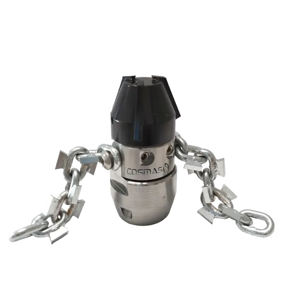 Rotační čisticí tryska s karbidovým řetězem Cosmas je vyrobena z nerezové oceli a osazena vysoce kvalitními řetězy s karbidovými hroty, které jsou pevně přivařené ke článkům řetězu. Díky tomu je tryska mimořádně účinná při odstraňování kamene, betonu a silně ztvrdlých usazenin uvnitř potrubí. Tryska je dostupná s nerezovými nebo keramickými vložkami, přičemž keramické vložky jsou doporučovány zejména při použití recyklované nebo znečištěné vody díky své vyšší odolnosti a delší životnosti. Trysky jsou k dispozici se čtyřmi vyměnitelnými hlavicemi – plná (cover), vrtací (drilling), karbidová (karbid) a nožová (knives), což umožňuje jejich přizpůsobení různým typům nečistot a pracovních podmínek. Maximální tlak 250 bar.